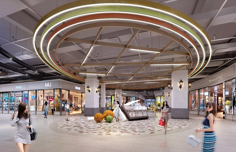 彩蛋广场作为地下一层的核心交通节点,伯雅创思在设计上引入线条圆形灯光的场景概念,地面运用了棕色与白色的不规则的方形、圆形线条相结合的设计风格,漂亮的建筑线条,充满简约的设计美学,且突出了核心中庭,使设计更具有趣味。通过多色的圆形灯条加上俏皮的球形摆设凸显动感,柔和的灯光打造出具有互动性、体验性的环境,让商业消费中拥有更多的参与感。
