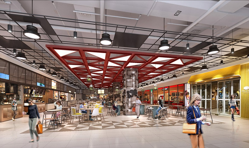 美食广场的设计,融入工业化的主题设计,天花用到了红色的钢构形式,结合灯光,色彩及材料的运用,强化了主题场景的趣味化特点。