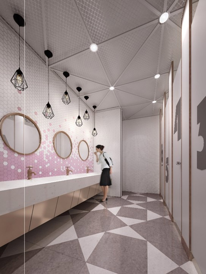 在主题街区设计中还考虑到了卫生间的人性化、趣味化设计诉求,在购物广场的卫生间设计中,以粉色与白色的六边形瓷砖白色文化砖墙面来营造清新雅致的氛围,椭圆形的镜子美观大方,香槟金色的边框与特色墙面相结合,造型的效果也是非常不错的,充分体现出时尚年轻群体的场景喜好。